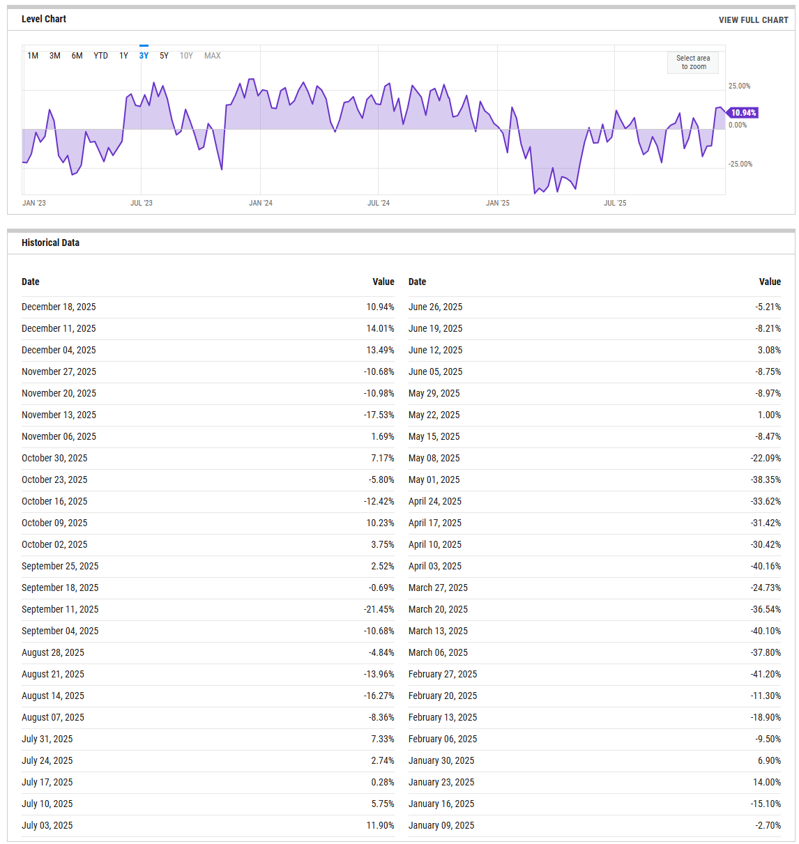 The percent bull minus bear spread is back in positive territory at 10.94% (Dec 18, 2025), but it cooled a bit from 14.01% the prior week (Dec 11) and 13.49% the week before that (Dec 04). That little dip matters less than the bigger story in the table: this measure has been whippy all year, with notable drawdowns into negative readings like -10.68% (Nov 27) and -17.53% (Nov 13), and much deeper earlier in the year including -41.20% (Feb 27) and -40.16% (Apr 03). In plain terms, sentiment has improved from washed-out levels, but it is not in a frothy, one-way extreme. The tripwires are straightforward: a bull-bear spread push above 20% would start to look crowded, while a slide back below 0% would swing the contrarian setup back toward rebound-friendly.