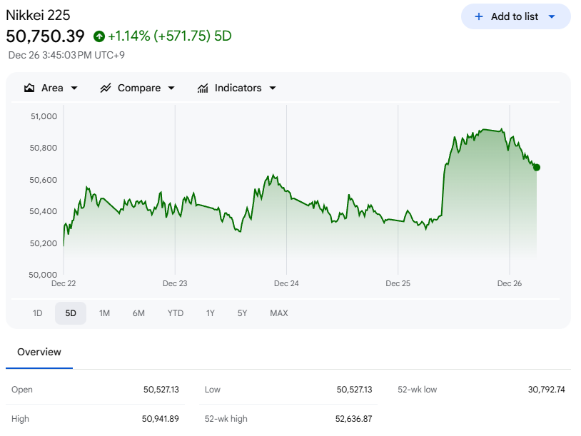 Overseas, markets added to the constructive backdrop. China’s Shanghai Composite rose +0.10%, marking its eighth consecutive daily gain. Japan’s Nikkei Stock 225 advanced +0.68%. European markets were largely closed for Christmas, with the Euro Stoxx 50 shut on Friday. The global picture was one of steady risk appetite, not exuberance.