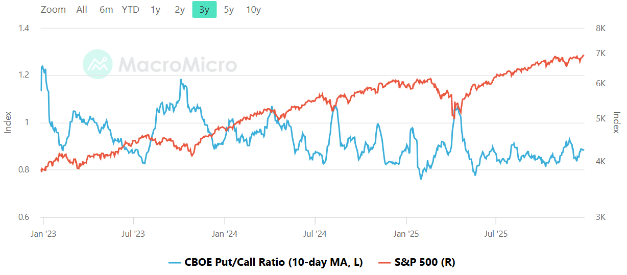 The put/call ratio shown is the 10-day moving average, and the key observable is that it is sitting below 1.0 and has been oscillating in a relatively tight band at the right edge of the chart. There is no visible spike to fear levels, and there is also no sustained collapse toward the frothier end of the range. That reads as a market that is not paying up for heavy protection, but also not completely abandoning it. In risk terms, this tends to produce shallower pullbacks and quicker dip-buying when the trend is intact, because positioning is not primed for a panic unwind. The flip side is that bounces can be more grinding than explosive when the market is already comfortably positioned and hedging is not overly stressed. The practical tripwires are the usual ones: a drop toward the ~0.8 zone is where exuberance starts to show up and marginal upside can get thinner, while a push up toward and through ~1.0 is where fear rises and the market often becomes more tradable on the long side after a wash.