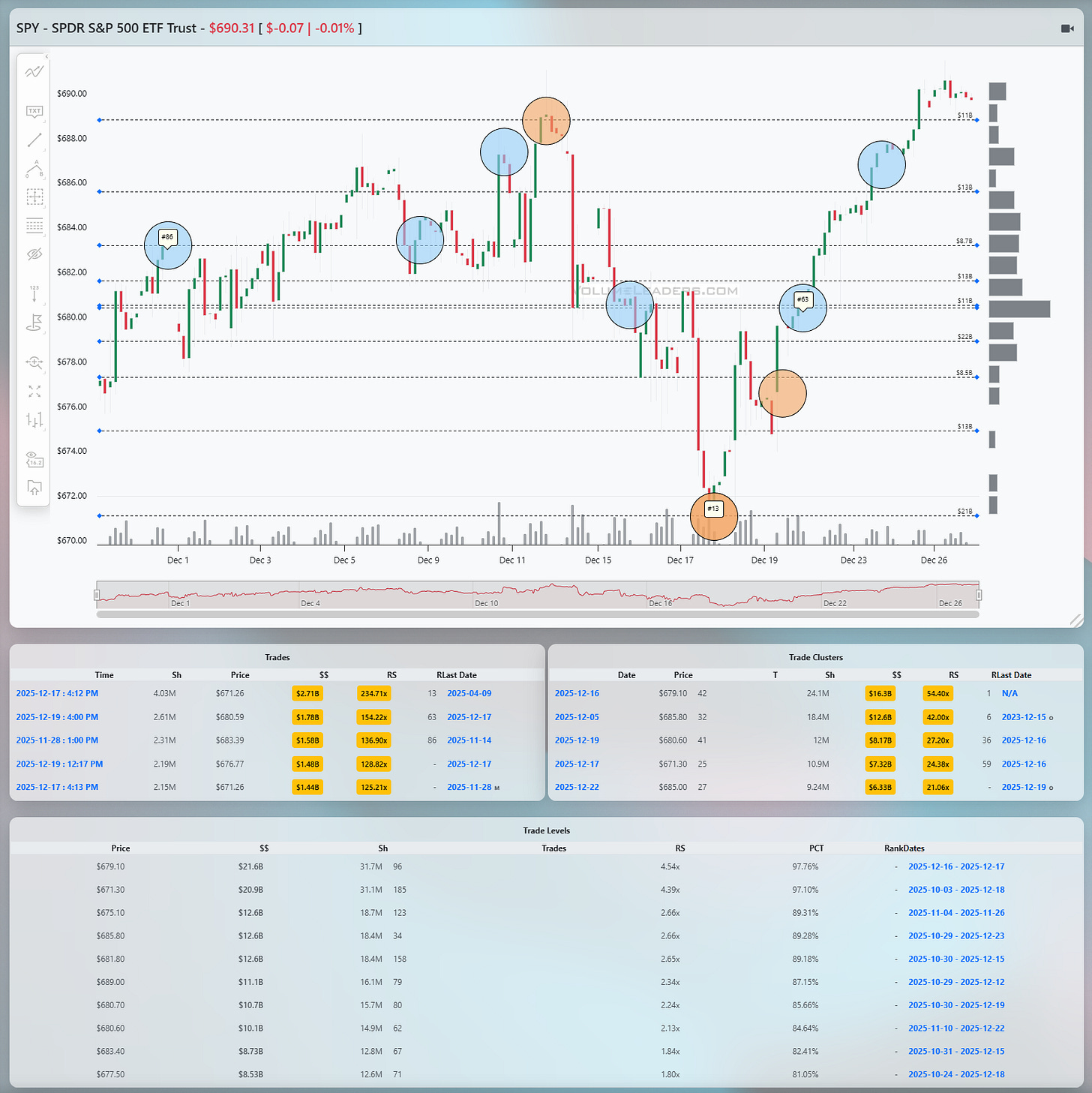 SPY set the tone. Early December was a steady, directional auction higher, punctuated by brief pauses that resolved upward. That structure broke in the middle of the month with a fast, emotional selloff that drove price into the low 670s. What mattered was not the speed of the drop, but what happened next. A very large print marked the low near 671, tagged as a top-100 historical trade, and price immediately reversed. That is classic absorption. Sellers pressed, size showed up, and the market could not go lower. From there, SPY rebuilt itself methodically. The recovery leg reclaimed the 680 handle, then worked through the low-to-mid 680s where multiple large trades printed without rejection. The highest concentration of notional in the Levels table sits just below current price, clustered around the upper 680s, with high RS and percentile readings that confirm real participation rather than thin air. As of the latest print near 690, SPY is pressing into prior supply from earlier in the month, but it is doing so from a position of balance, not exhaustion. The line of scrimmage is the 682 to 684 band. Acceptance above it keeps the upside case intact, with the next magnet just above 690. A failure back below 680 would be the first sign that this rally is losing sponsorship.