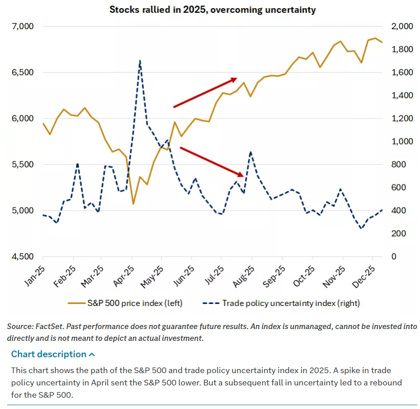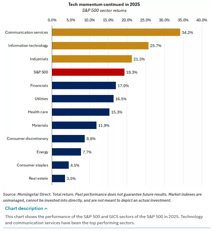 Second, technology led U.S. markets and supported economic growth. The technology and communication services sectors gained more than 25% in 2025, ranking among the top performers for the third straight year. Earnings growth in these sectors is on track to exceed 15%, fueled by sustained AI investment.