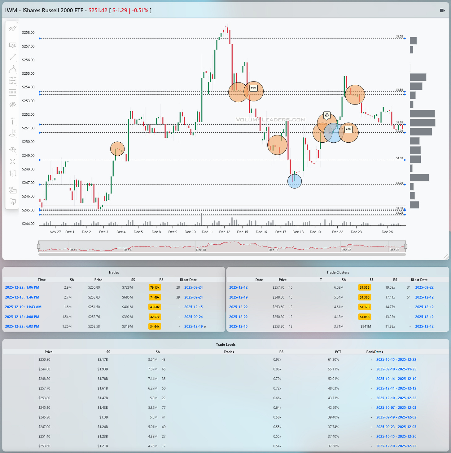 IWM continues to be the most workmanlike of the group, and also the most honest. It rallied hard into mid-December, topping near the upper 250s, then unwound sharply into the high 240s. The low near 247 was met with a large print and immediate bounce, but unlike SPY and QQQ, the rebound here has been choppier. The Levels table shows the most significant notional concentrated between roughly 248 and 252, with RS readings that are solid but not extreme. That defines the current balance zone. Recent sessions saw attempts higher into the 253 to 254 area, marked by clustered selling, and price was pushed back toward the middle of the range. For IWM, the line of scrimmage is clear: 250 to 251. Acceptance above 253 would open a path back toward the highs, while failure below 248 would put the December lows back in play. Until one of those resolves, small caps are trading rotation, not impulse.