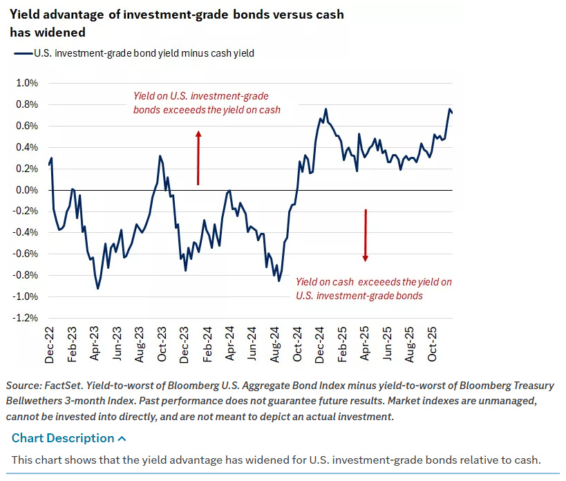 Fourth, bonds reclaimed leadership over cash. U.S. investment-grade bonds gained more than 7% in 2025, outperforming cash by roughly 3%, the widest margin since 2020. Treasury yields declined across most maturities as the Fed cut rates by 0.75% and labor markets cooled. By year-end, the yield on investment-grade bonds was approximately 0.7% higher than that of cash, near the upper end of its three-year range.