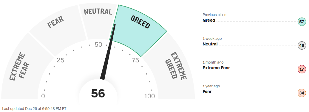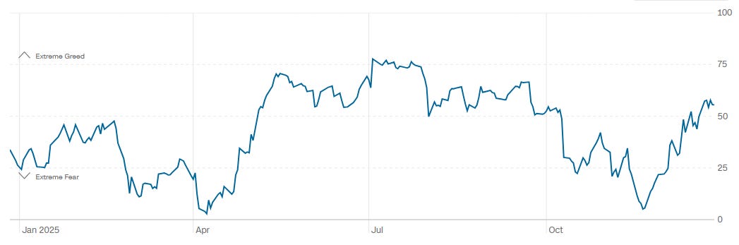 The composite Fear and Greed reading is 56, which sits in Greed, and it is a clear improvement from 49 one week ago. The same panel shows how sharp the swing has been: one month ago it was 17 (Extreme Fear), and one year ago it was 34 (Fear). The 1-year path reinforces that regime shift. The line spent a good portion of the year in a higher band, then suffered a notable air pocket into the low end of the scale later in the year, and has now rebounded back into the mid-range. That is usually the sweet spot for sustained advances: optimistic enough to keep buyers engaged, but not so euphoric that the market becomes fragile to minor disappointments. The levels to watch are clean: a move up toward the mid-70s and beyond is where exhaustion risk starts to rise, especially if it happens alongside weakening breadth. A relapse back under 30 would suggest fear is returning and would often improve forward entry quality, provided price is not breaking major support.