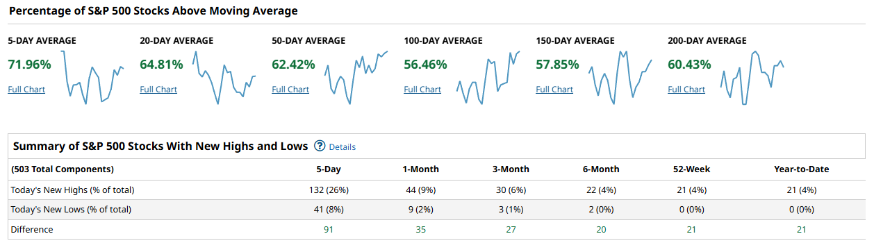 In the S&P 500, participation is clearly on the right side of the ledger. About 71.96% of constituents are above their 5-day average, 64.81% are above the 20-day, and 62.42% are above the 50-day, which is what you want to see when a market is pressing higher without relying on a tiny handful of names. The longer measures are positive but not yet overwhelming, with 56.46% above the 100-day, 57.85% above the 150-day, and 60.43% above the 200-day. That profile reads like an advance that has regained its footing and is trying to turn into something sturdier. The new highs versus new lows data supports that: over the past 5 days there were 132 new highs versus 41 new lows for a net of +91, and even out at 52-week and year-to-date the net is +21 with zero new lows in those buckets. That is not a market under distribution pressure; it is a market where demand is showing up and downside leadership is scarce.