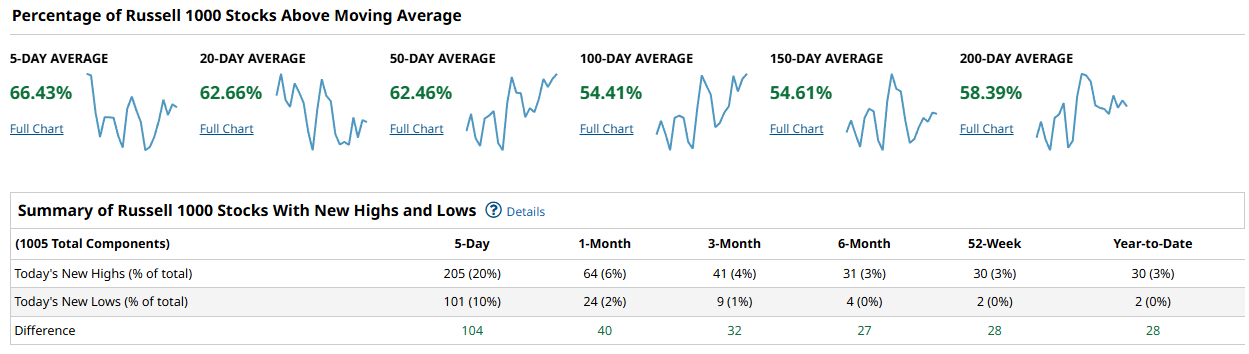 The Russell 1000 is constructive, but it is also the one that best captures the market still working through the middle of the tape. Near term you have 66.43% above the 5-day and 62.66% above the 20-day, with 62.46% above the 50-day. Like the Nasdaq, the intermediate trend measures sit in the mid-50s: 54.41% above the 100-day and 54.61% above the 150-day, with 58.39% above the 200-day. That says the broad large-cap universe is participating, but a meaningful chunk is still either repairing prior damage or lagging just enough to keep the 100 to 150-day cohorts from clearing into the high ground. New highs versus new lows are decisively positive, though: 205 highs versus 101 lows over 5 days for +104, and the net remains positive across the longer lookbacks (+40 over 1-month, +32 over 3-month, +27 over 6-month, and +28 over both 52-week and year-to-date). So while the intermediate participation is not yet robust, the market is still producing more upside breakouts than breakdowns.