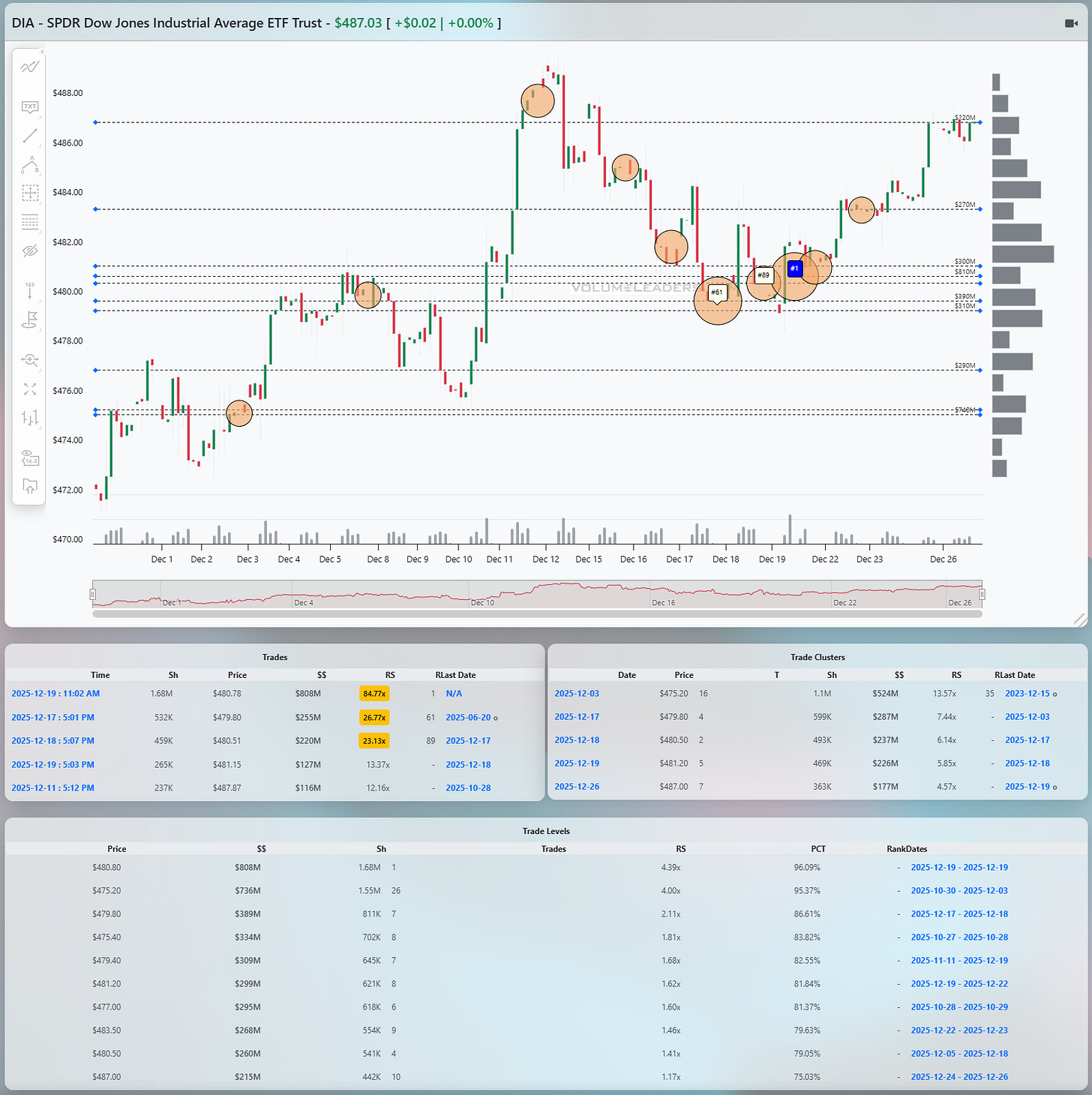 DIA has quietly been the most technically complete. The early December rally was strong, followed by a controlled pullback into the high 470s. Multiple large trades printed around 479 to 481, including a notable cluster with high percentile readings, and price held. From there, DIA resumed higher, reclaiming 483, then pushing into the upper 480s. The Levels table shows a dominant notional shelf centered around 480, with RS above 4x and percentile readings in the mid to high 90s. That is real sponsorship. Price is now hovering near 487 to 488, just under prior highs. The key is behavior, not direction. As long as DIA holds above 480, pullbacks are corrective. Acceptance above 488 would confirm another leg higher. A failure back through 478 would be the first real warning that this structure is breaking.