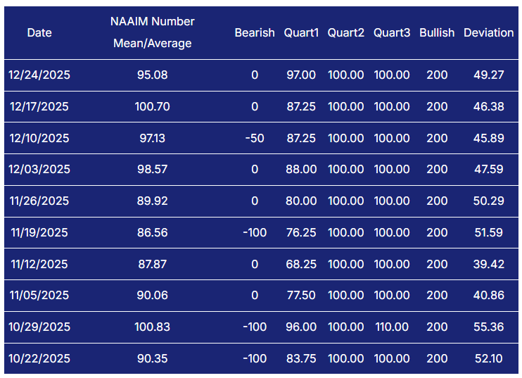 NAAIM echoes that posture. The exposure index sits at 95.08 on 12/24/2025, down from 100.70 on 12/17, and in line with recent elevated readings like 97.13 (12/10) and 98.57 (12/03). Managers are largely in, which supports trend persistence when price is behaving, but it also reduces the amount of easy buying power left if the tape stumbles. A drop into the 50s without major price damage would be a constructive reset, while a push back toward the high 90s and 100s keeps the market vulnerable to any fast de-risking episode.