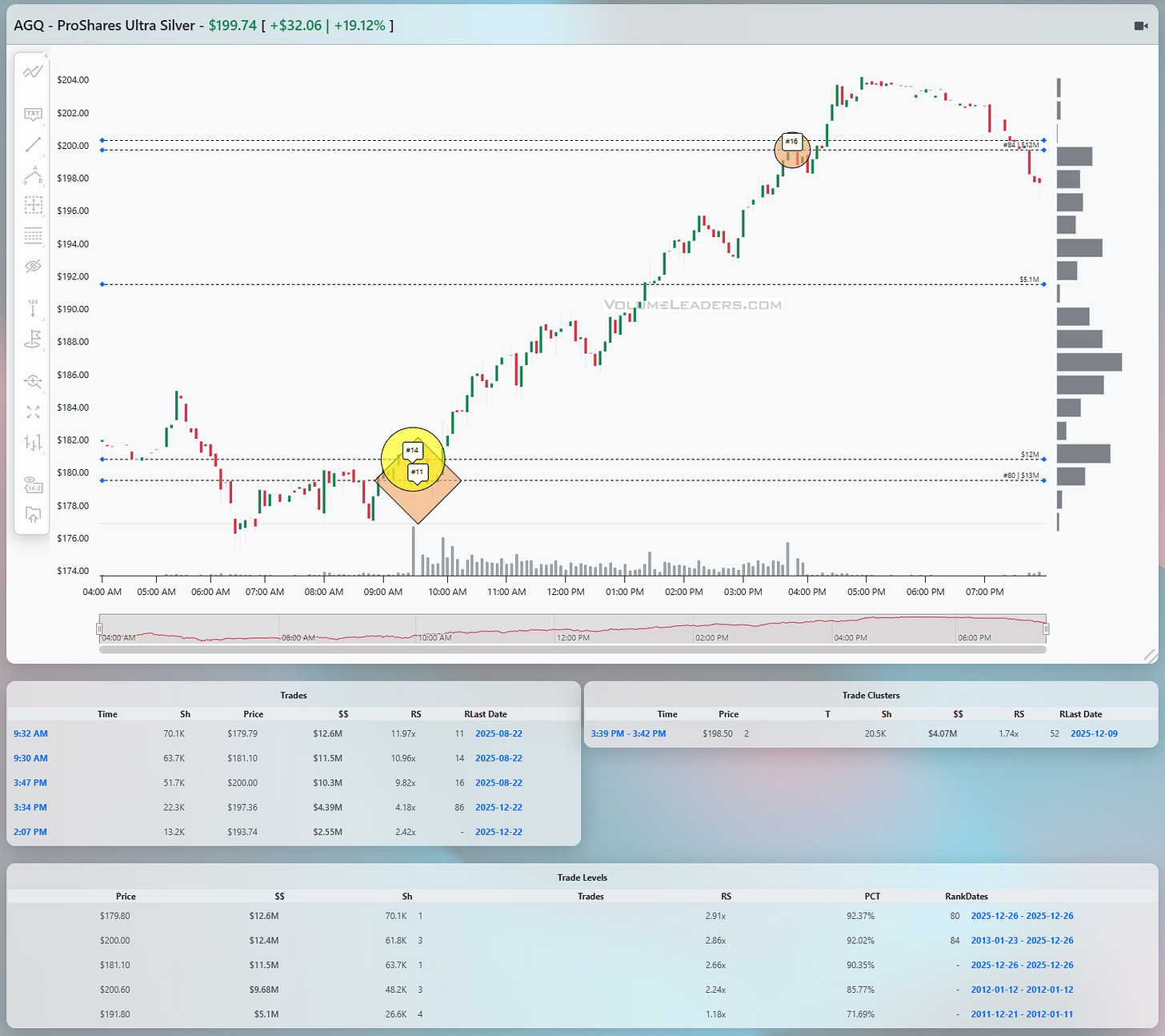 As AGQ pushed through the 190s, volume expanded, but the character of the tape stayed orderly. This was not a blow-off. It was controlled continuation. The next major tell came late in the afternoon at $200-even. A large cluster printed just below 200, again with elevated relative size; clusters are zones where institutions are busy adjusting inventory. This time, however, the context was different. Price had already traveled a long distance intraday, and this cluster appeared at a psychologically obvious level. It was also clearly punctuated with a rank #16 trade. The market did push slightly higher afterward, but the follow-through was muted. Instead of acceleration, price began to stall.