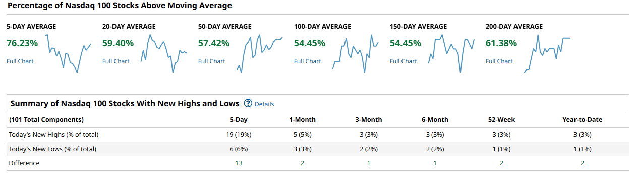 Bottom line: breadth is bullishly aligned and improving, but the advance becomes truly durable when the 100-day and 150-day participation in the broad indexes clears and holds above 60% while new highs keep outpacing new lows.