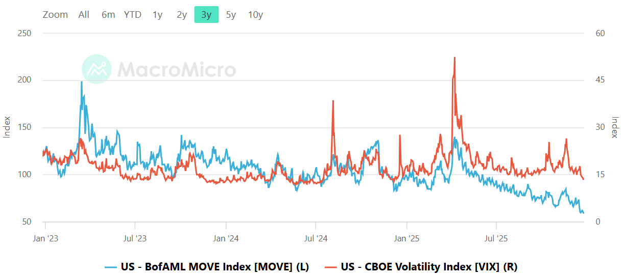 The MOVE and VIX relationship is calm by inspection, with bond volatility trending lower into the right side of the chart while equity volatility remains comparatively subdued and rangebound. There is no visible regime where both are expanding together in a sustained way, which is typically what you see when liquidity is deteriorating and risk assets are under stress. This matters because when the bond market is unstable, it often bleeds into equity via rates, funding conditions, and discount-rate narratives; when bond vol is compressing, equities usually get permission to trend. The message this week is that the volatility complex is not flashing urgent risk, and that tends to support continuation as long as price and breadth stay constructive. The tripwires remain the classic ones: a MOVE surge above roughly 120 while VIX stays sleepy is often an early warning that equities are next, and a VIX push into the high teens and above is where drawdowns begin to feel more persistent and less buyable on the first touch.