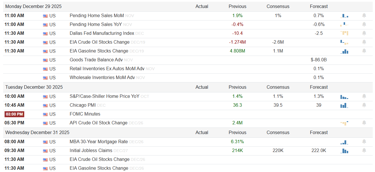 The final full trading week of the year brings a light but potentially market-moving macro slate, with housing, regional manufacturing, energy inventories, labor, and one last look at Fed thinking via the FOMC minutes. Liquidity will thin as the week progresses, which means reactions may be exaggerated relative to the information content. With no earnings on the calendar and the market closed Thursday for New Years Day, this is a week where macro prints can punch above their weight, especially if they lean consistently in one direction.
