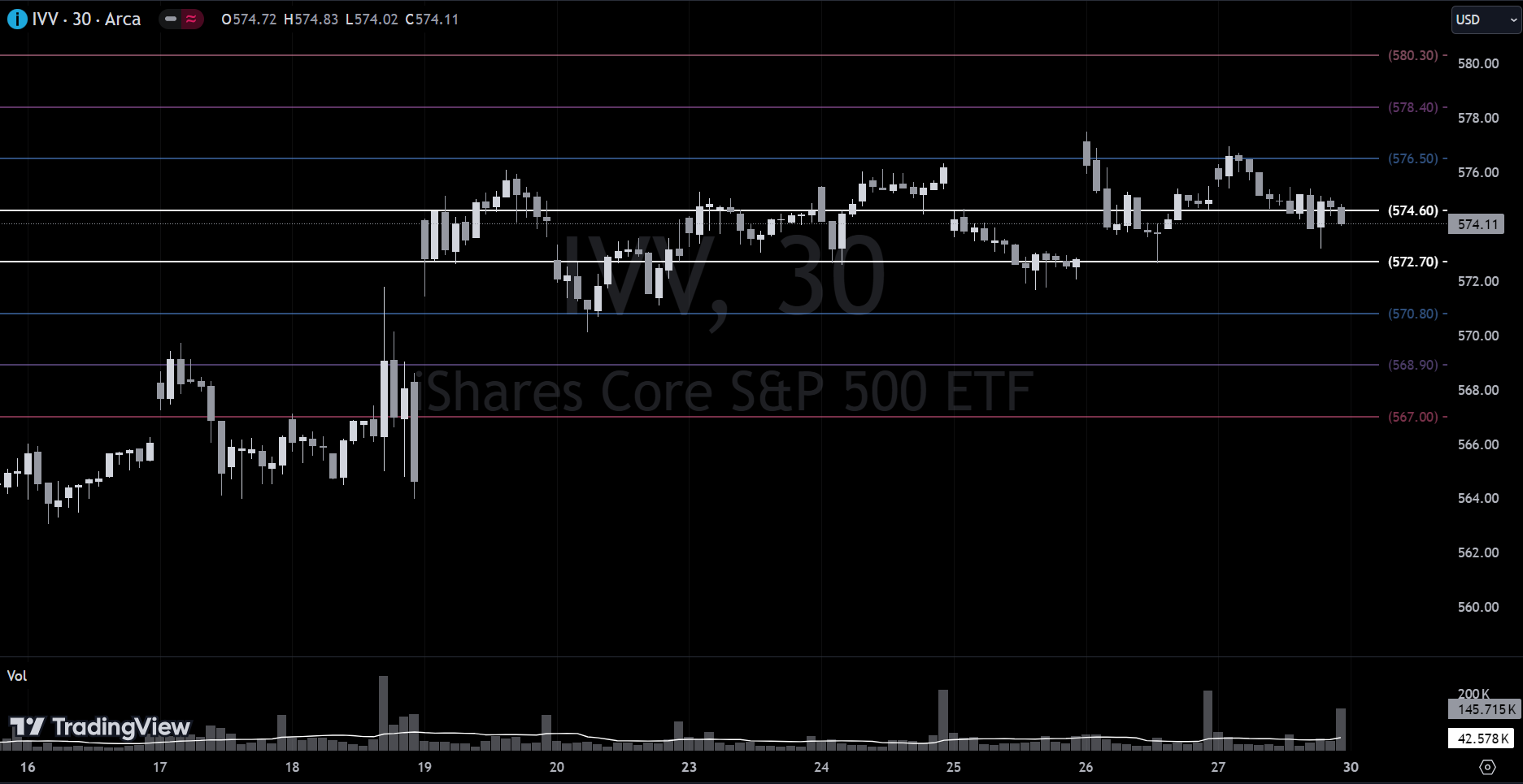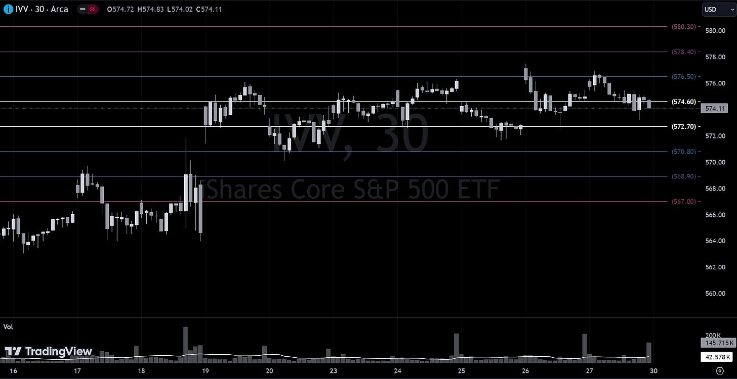 The volume we’ve seen in recent days has been incredible, including a #2-ranked trade (second largest in the ticker’s history). Playing level-to-level as we do, you’re going to want to monitor $525.52; setup an alert in your trading platform. If price has trouble holding there, it looks like we could trade back to $517.40 and that would be the first place to look for some support. VL users - while you’re looking at this, also checkout IVV 0.00%↑ in the platform