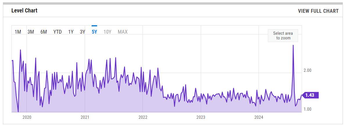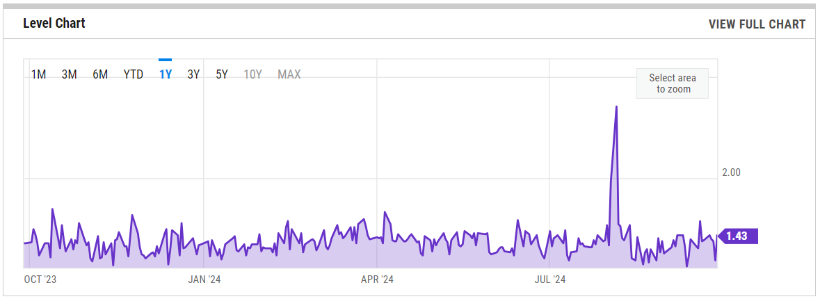The SPX Put/Call Ratio is an indicator that is used to gauge market sentiment. This is calculated as the ratio between trading S&P 500 put options and S&P call options. A high put/call ratio can indicate fear in the markets, while a low ratio indicates confidence. For example, in 2015, the Put-Call ratio was as high as 3.77 because of market fears stemming from various global economic issues like a GDP growth slowdown in China and a Greek debt default.