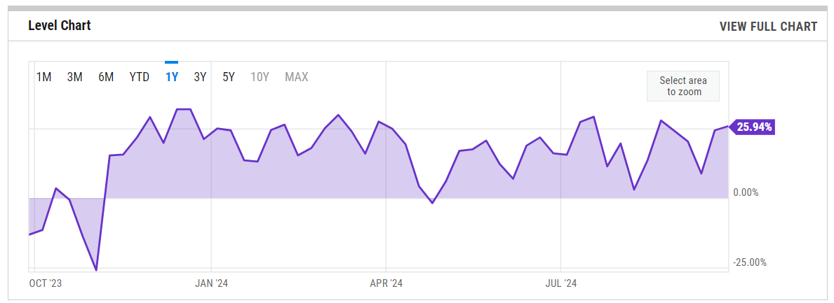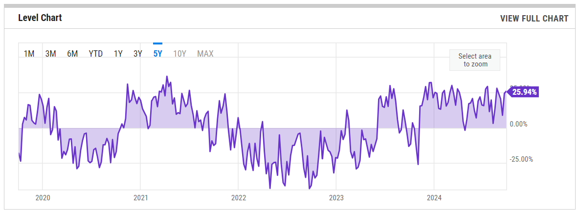 % Bull-Bear Spread is at 25.94%, compared to 24.42% last week and -3.31% last year. This is higher than the long-term average of 6.71%