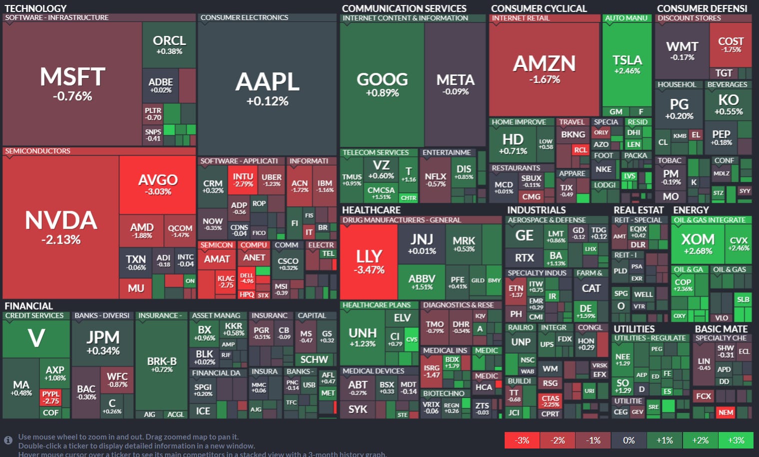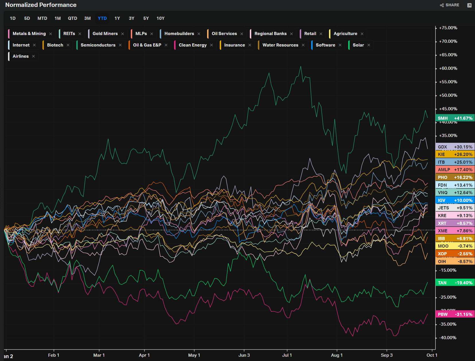 VolumeLeaders.com provides a lot of pre-built filters for thematics so that you can quickly dive into specific areas of the market. These performance overviews are provided here only for inspiration. Consider targeting leaders and/or laggards in the best and worst sectors, for example.