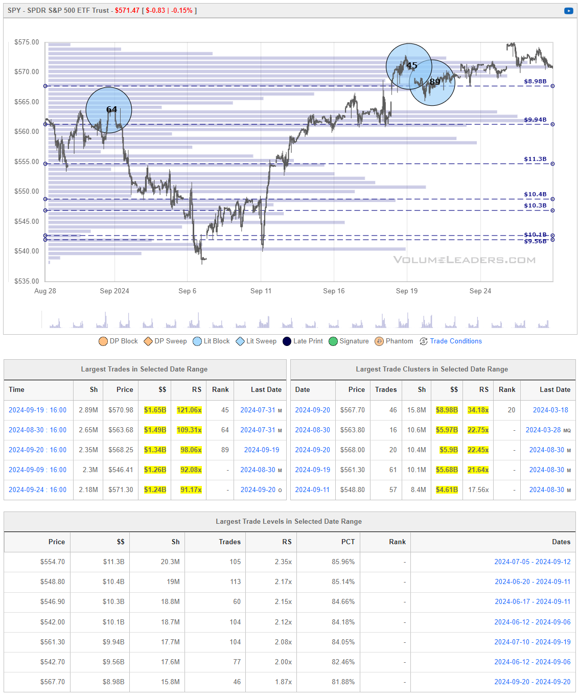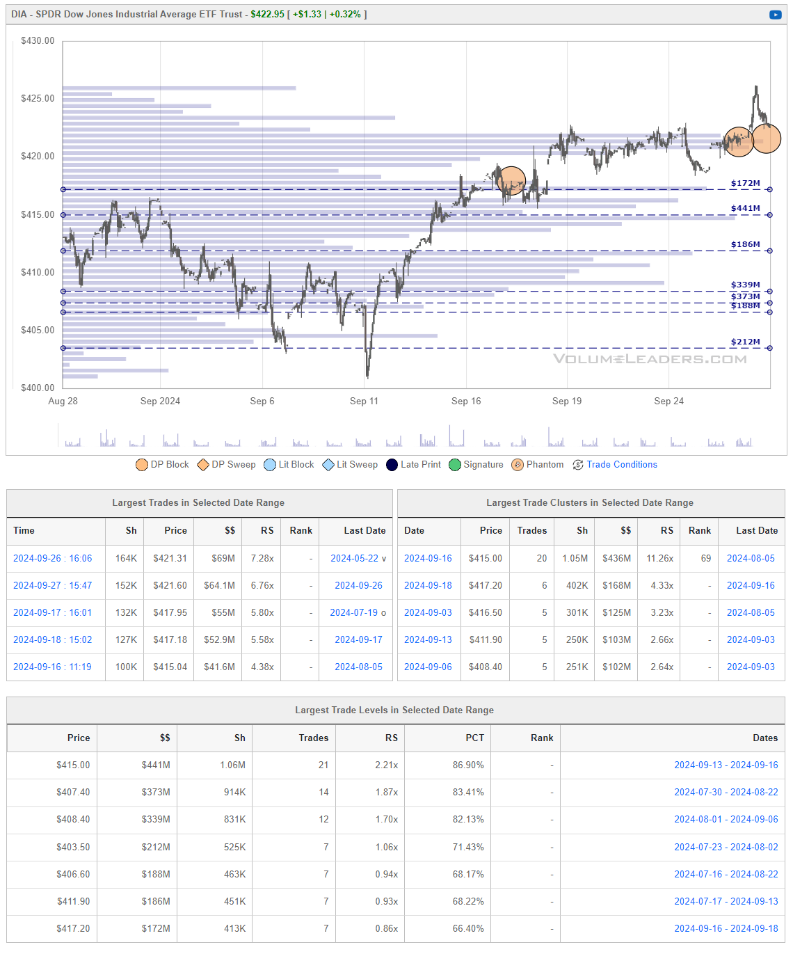 Many excellent trade ideas and sources of inspiration can be found in these prints. While only the top 30 from each group are displayed, the complete results are accessible in VolumeLeaders.com for your convenience to explore at any time. Remember to configure trade alerts within the platform to ensure you never overlook institutional order flows that capture your interest or are significant to you. The blue charts encompass all types of trades, including blocks on lit exchanges; the red/orange charts exclusively depict dark pool trades; and the green charts represent sweeps only.