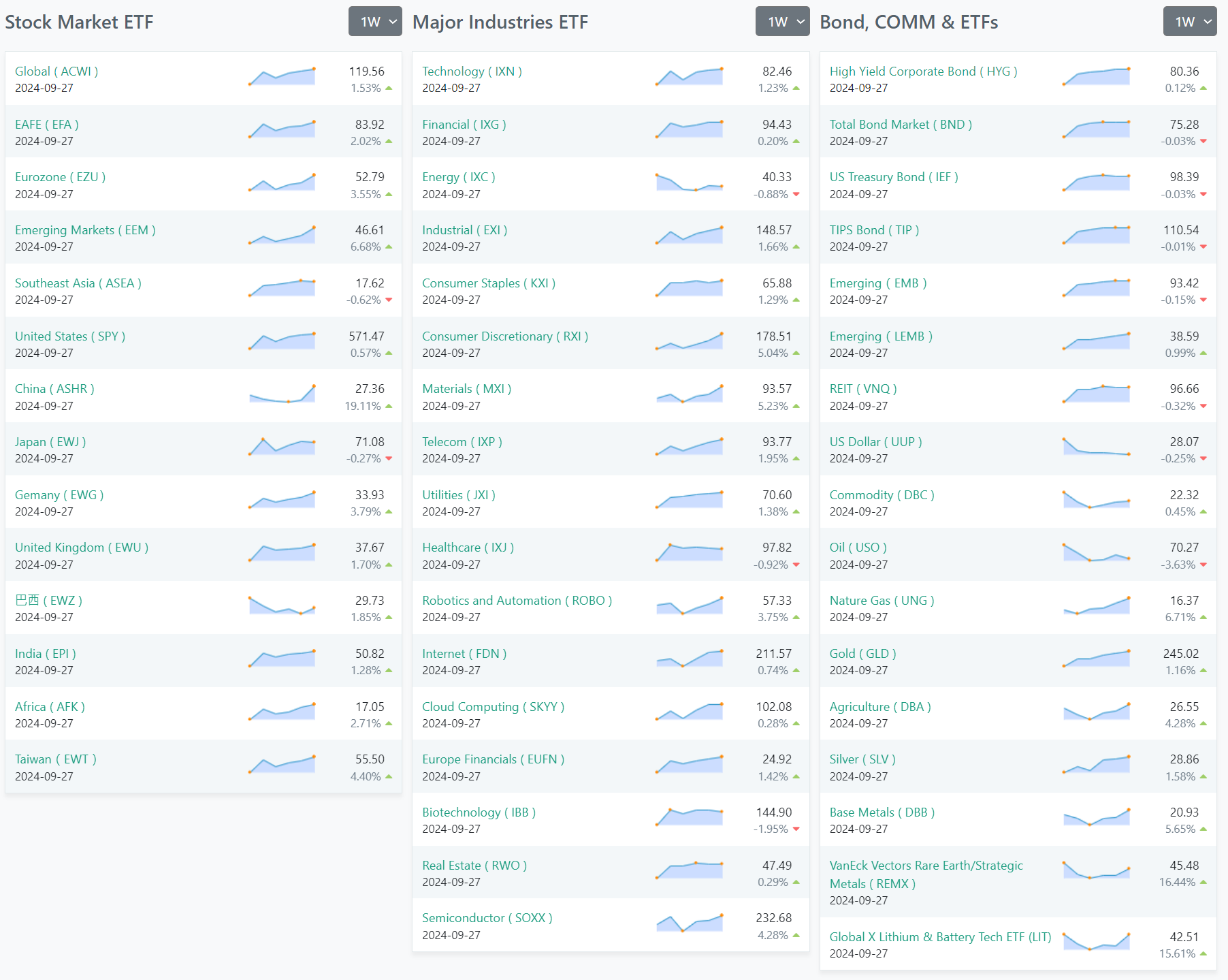 Conversely, in the Bonds, Commodities, and other ETFs section, while traditional safe-haven assets like US Treasury Bonds showed slight declines, the Natural Gas (UNG) ETF rose by 6.71%, and the Global X Lithium & Battery Tech ETF (LIT) increased significantly by 15.61%. This suggests a growing investor interest in energy and technology-focused commodities.
