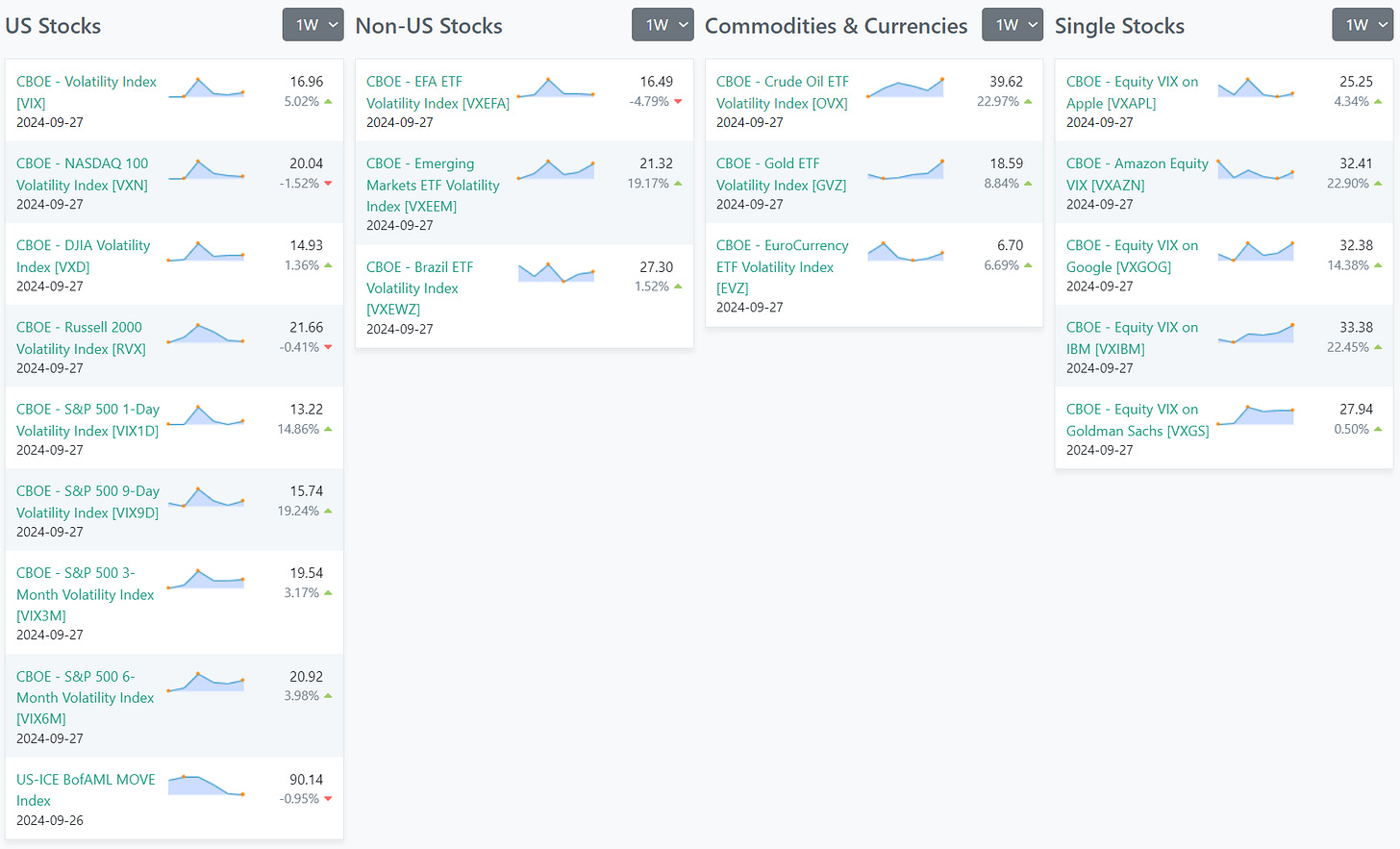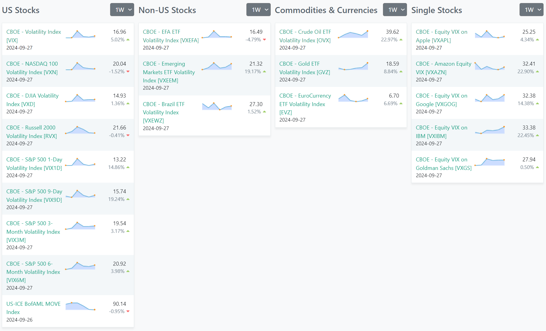 In US stocks, the CBOE Volatility Index (VIX) shows an appreciable uptick, hinting at heightened expected volatility in the S&P 500. This trend of increased volatility is reflected across other indices such as NASDAQ 100 and DJIA, albeit with variations in the percentage changes. Non-US stocks, represented by ETFs like the EFA ETF and Emerging Markets ETF, also broadly exhibit changes in volatility, with the Emerging Markets ETF Volatility Index notably rising by 19.17%. In the commodities and currencies sectors, there is a marked rise in volatility for crude oil and gold, with crude oil ETF volatility surging by 22.97%. Currency volatility, illustrated by the EuroCurrency ETF, has risen as well. Additionally, volatility indices for individual stocks like Apple, Amazon, Google, IBM, and Goldman Sachs vary, with Amazon's volatility increasing by 22.9%. This data collectively points to a general increase in market volatility across various sectors and geographies.