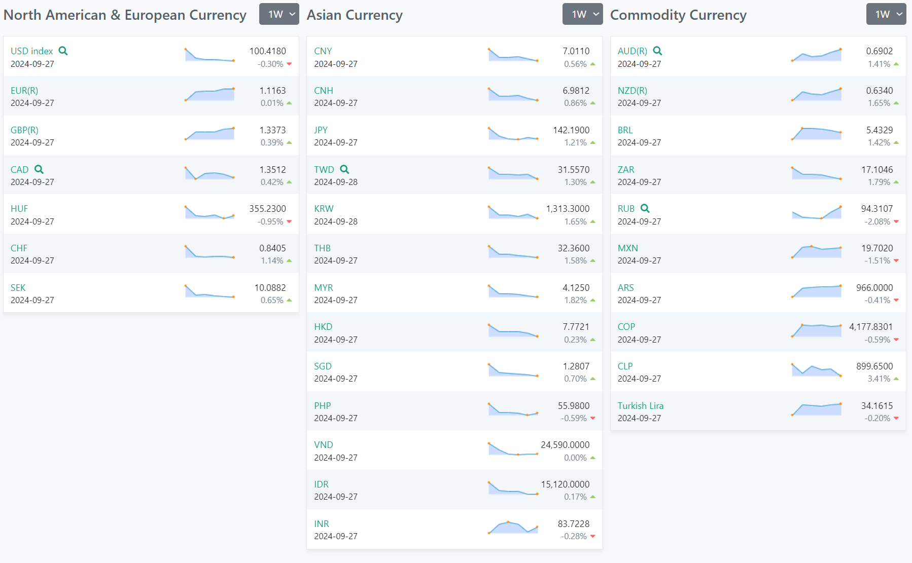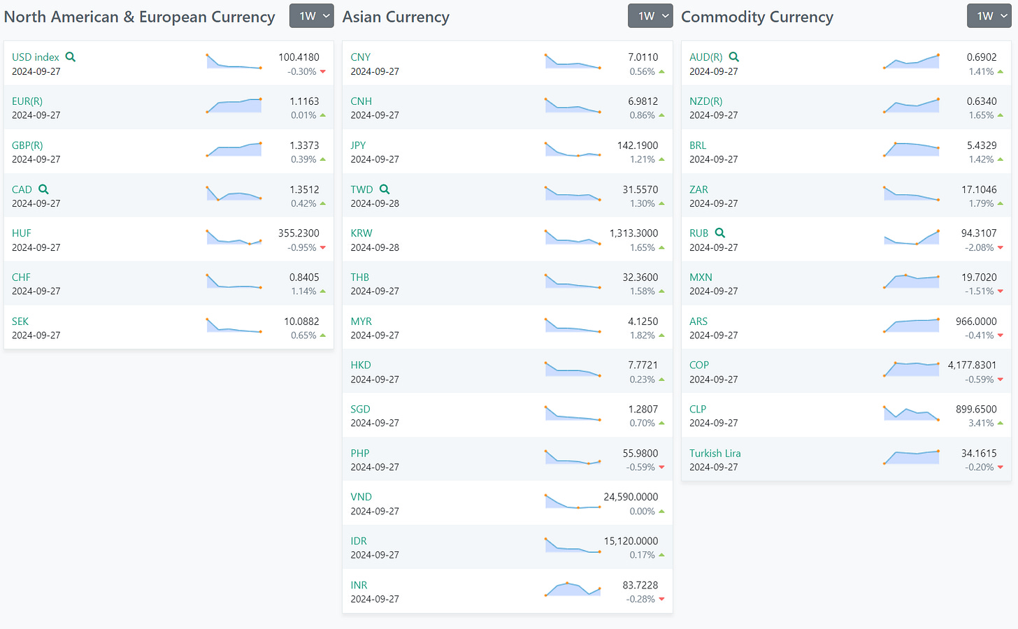 In the Asian Currency category, there are noteworthy increases in the Japanese Yen (JPY) and the Korean Won (KRW), while the Chinese Yuan (CNY) shows a modest rise. This could indicate stronger economic outlooks or market reactions in these regions.