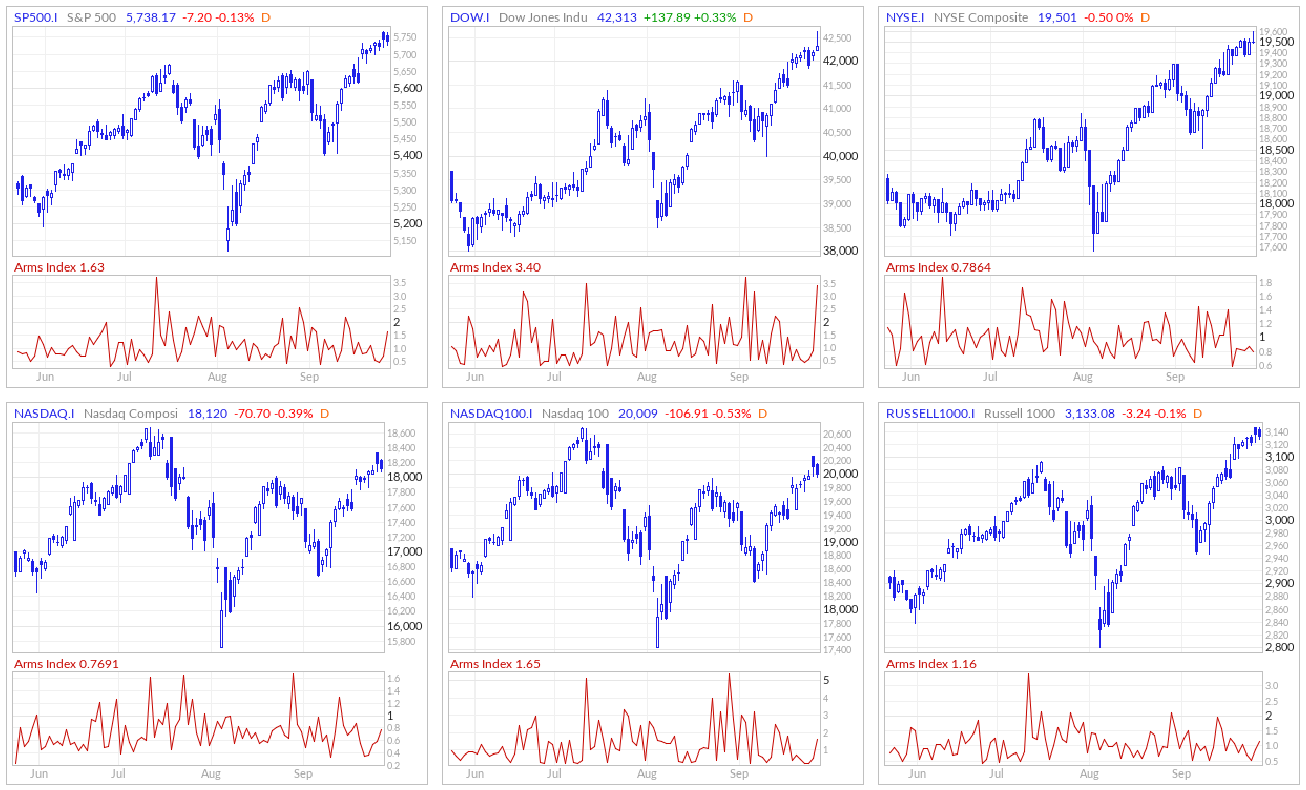The Arms Index, also known as the TRIN (Short-Term TRading INdex), was developed by Richard Arms in the 1960s. It is calculated by dividing the ratio of advancing stocks to declining stocks by the ratio of advancing volume to declining volume. Interpreting the Arms Index involves looking at its value in relation to certain thresholds. A value below "1" is considered bullish, indicating that advancing stocks and volume dominate the market. Conversely, a value above "1" is considered bearish, suggesting that declining stocks and volume are more prevalent. Extremely low values (below 0.5) or high values (above 2) are often seen as potential reversal signals.