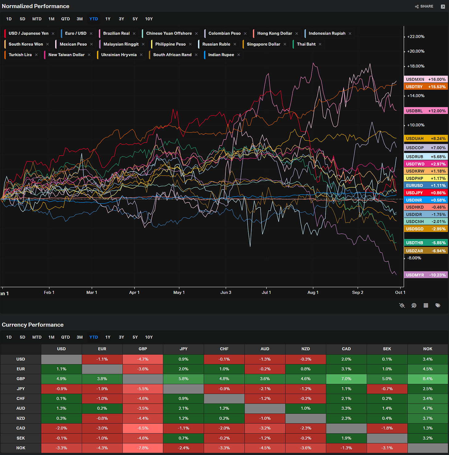 Notably, the USD Index has declined by 3.0%, suggesting a weakening of the US dollar against a basket of other currencies. This decline is contrasted by gains in several European currencies such as the Swiss Franc (CHF) and the British Pound (GBP), which have increased by 1.14% and 0.39% respectively.