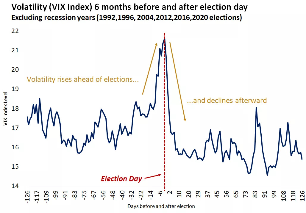 As the U.S. approaches election day, markets are expected to experience volatility, but this is likely to be short-lived. Historically, market turbulence surrounding elections is driven by the repricing of potential new policy proposals rather than a fundamental reaction to the election outcome. Market volatility has typically subsided once a clearer policy direction emerges, regardless of which political party assumes power. For instance, after the 2000 election, marked by the "hanging chad" controversy, volatility persisted until the Supreme Court resolved the outcome in mid-December. However, following the resolution, volatility, as measured by the Cboe Volatility Index (VIX), declined substantially.