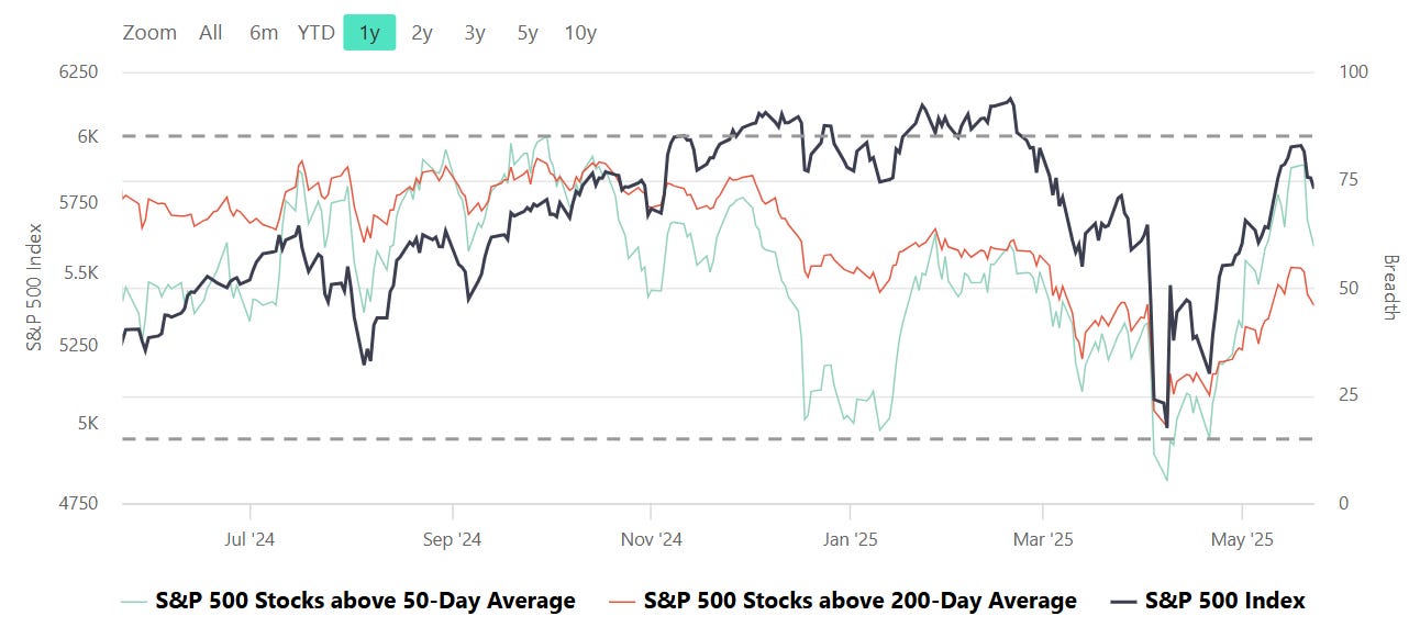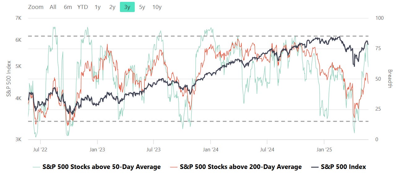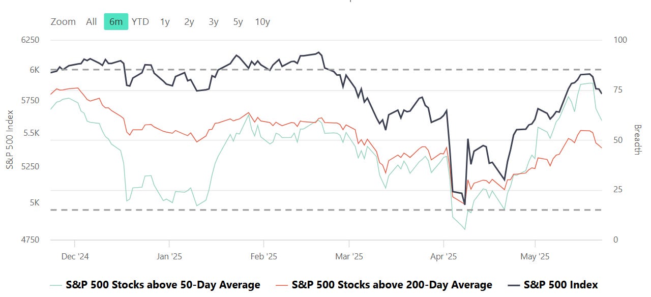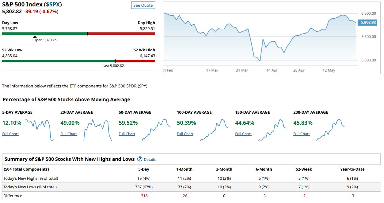 Despite the S&P 500 index ($SPX) hovering near 5,800, breadth data suggests a weakening internal structure beneath the surface. The index is down 0.67% on the day, and although it remains well above its 52-week low, participation is notably thinning: